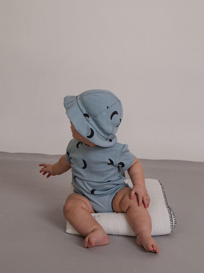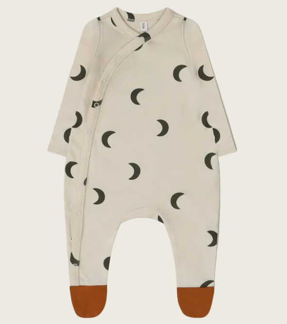 三日月や星をモチーフにした深みのあるネイビー系の柄です。Wrap Bodysuit・Zoonie・Sweatshirtなど幅広いアイテムに展開されています。
