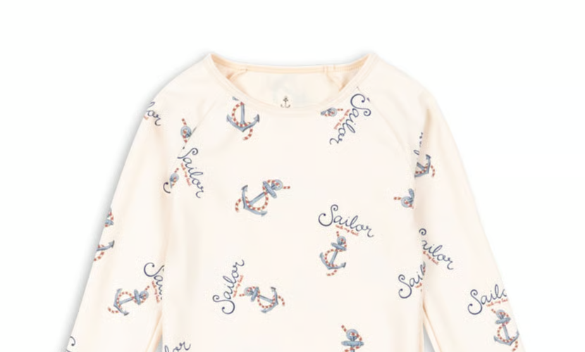 GRS(Global Recycled Standard)認証のリサイクル素材を使ったスイムブラウス。夏のプールや海水浴に向けての出産祝いとして、一足先に贈るのも喜ばれます。UVカット対応でママも安心。