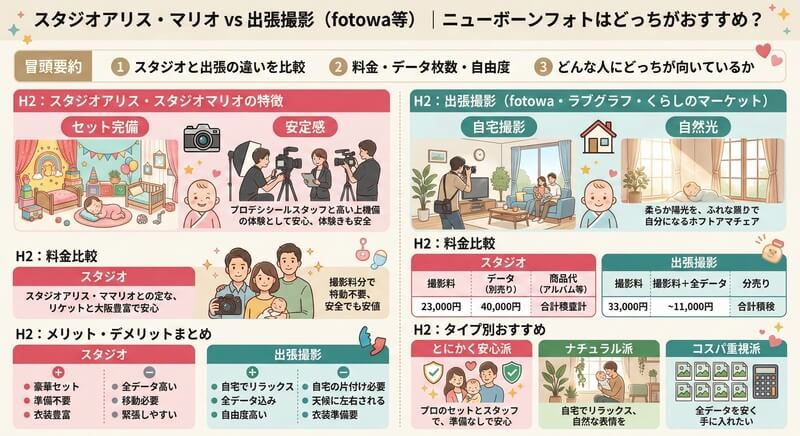 どちらを選ぶにしても、赤ちゃんが安心できる環境で撮影することが最も大切です。後悔のない選択をして、一生の宝物になる一枚を残してください。