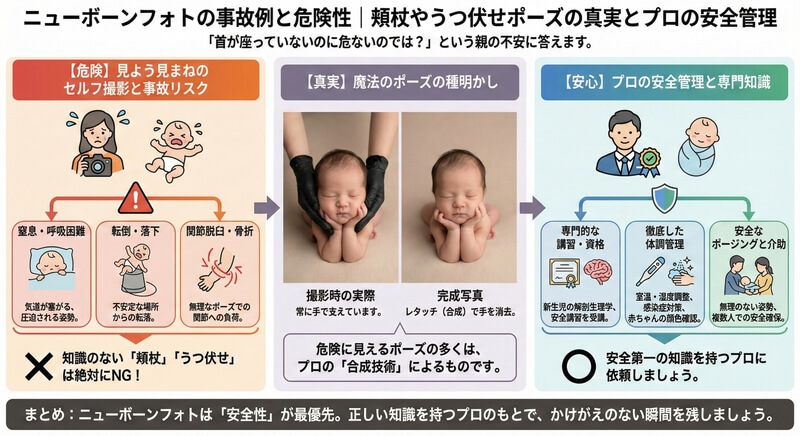 ニューボーンフォトの事故例と危険性|頬杖やうつ伏せポーズの真実とプロの安全管理