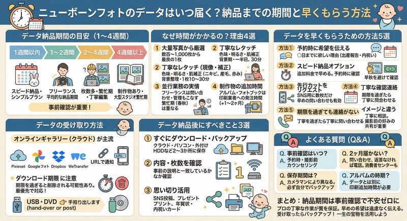 この記事が、ニューボーンフォトのデータ納品に関する不安や疑問の解消にお役立ていただければ幸いです。
