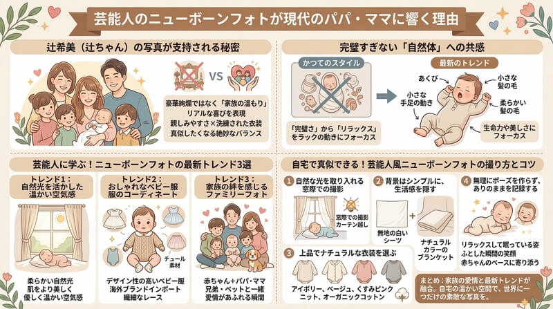 辻希美さんをはじめとする芸能人が発信するニューボーンフォトには、家族の愛情と最新のトレンドが美しく融合しています。自然光を活かした柔らかい描写、洗練されたベビー服、そして作り込まない自然体なスタイルは、現代のパパとママにとって最高のヒントになります。
