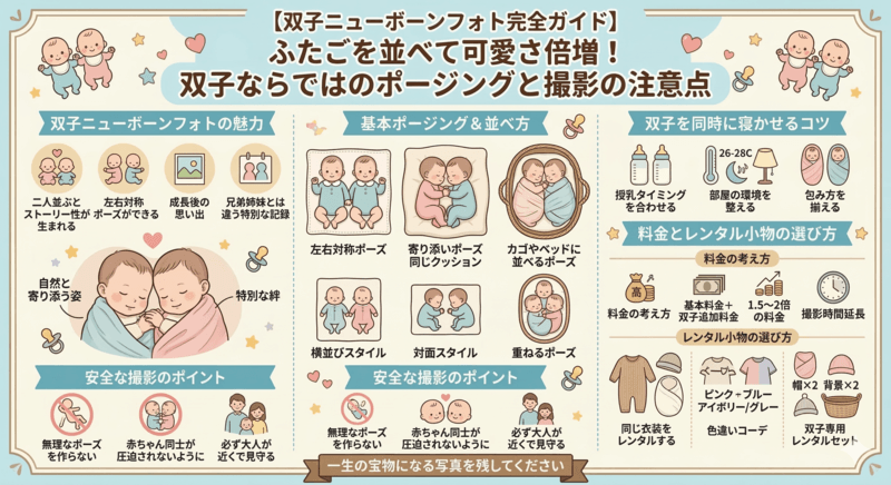最近では、双子ファミリーのニーズに応え、双子ニューボーンフォト専用のレンタルセットを提供するサービスも増えてきています。