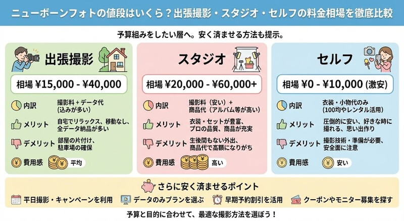 まず、ニューボーンフォトにかかる費用の全体像を掴みましょう。撮影スタイルによって、相場は大きく異なります。