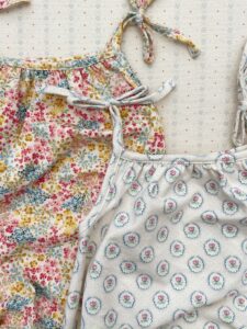 新生児~生後半年くらいの赤ちゃんは割と通年着用できるアイテムも多いので、ボディースーツとボンネットの組み合わせ+小物で選ばれる方が多いです。