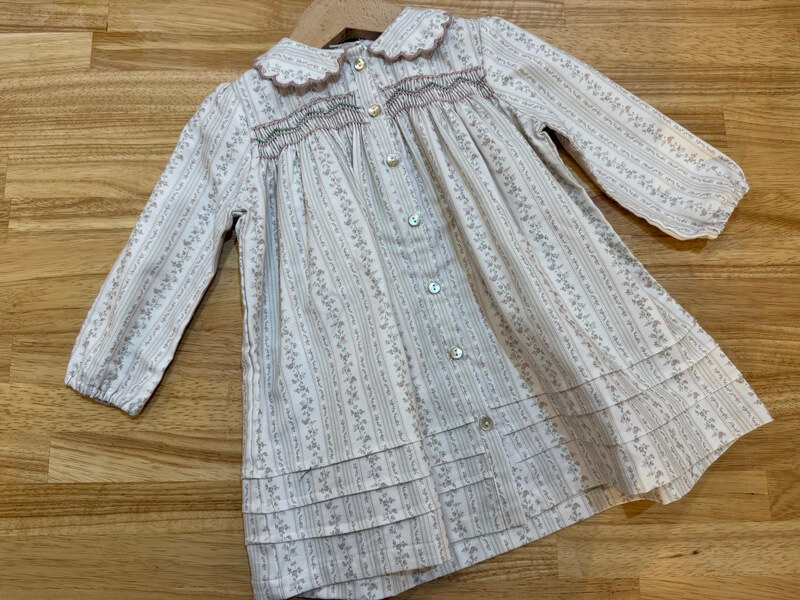Marie Puceの象徴ともいえるアイテムが、この花柄ワンピースです。小花柄や淡いカラーが多く、レトロシックなパリらしさを最も感じられる一枚として、多くのファミリーに支持されています。