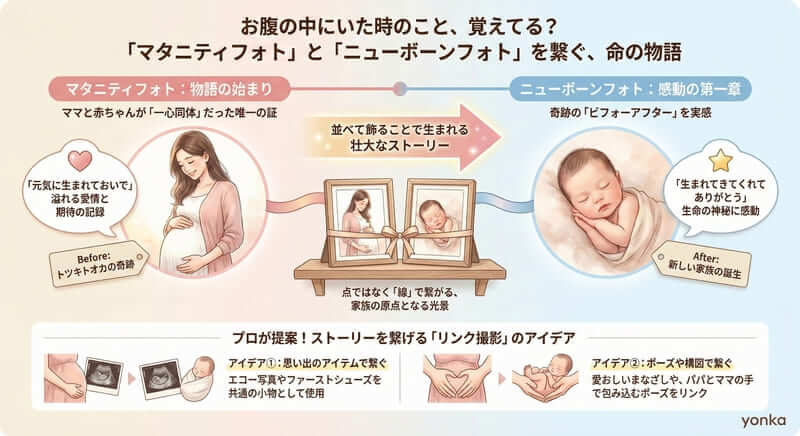 今回は、数多くのご家族の節目に立ち会ってきたyonkaが、マタニティフォトとニューボーンフォトを「点」ではなく「線」で繋ぐことで生まれる、かけがえのない価値についてお伝えします。
