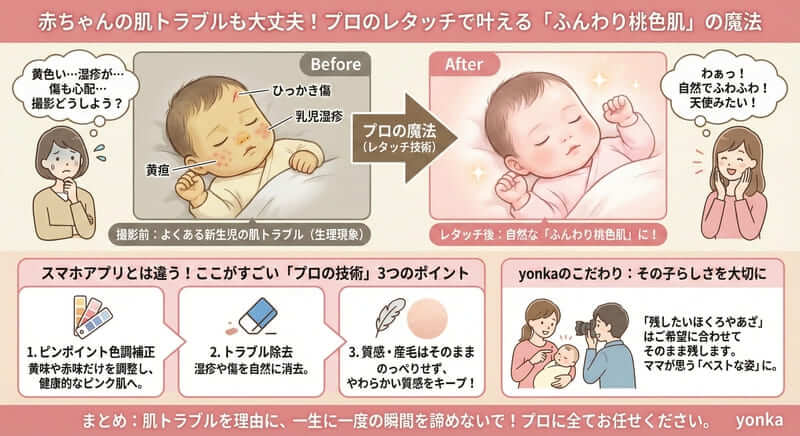 3. 赤ちゃんの「乳児湿疹」や「黄疸」があっても大丈夫?プロのレタッチ技術で叶える、ふんわり桃色肌の魔法