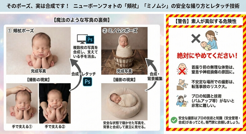 SNSで完成写真だけを見て、「うちの子もできるかも」と自宅で挑戦するのは絶対にやめてください。プロは、赤ちゃんの関節の可動域や安全な支え方を熟知した上で、合成前提で撮影しています。知識のないままポーズをとらせることは、事故に直結します。