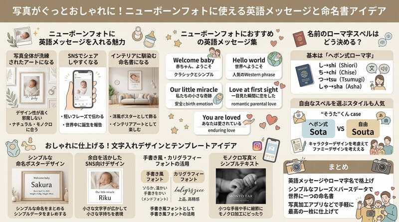 この記事では、ニューボーンフォトにぴったりな英語のメッセージフレーズや、迷いがちなローマ字のスペル選び、そして命名書としても使えるおしゃれな文字入れデザインのアイデアを詳しく解説します。これから写真の編集やアイテム作りをする方は、ぜひ参考にしてください。