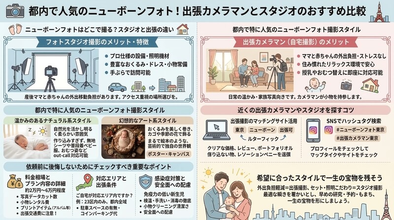 この記事では、都内で人気のニューボーンフォト撮影について、スタジオ撮影と出張カメラマンの違いやそれぞれのメリットを比較します。また、ご自宅近くのサービスの探し方や、依頼する前に確認しておきたい重要なポイントも詳しく解説します。