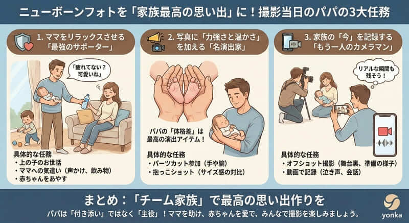 いえいえ、とんでもない!はっきり申し上げます。ニューボーンフォトを成功させるためのキーパーソンは、間違いなく**「パパ」**です。